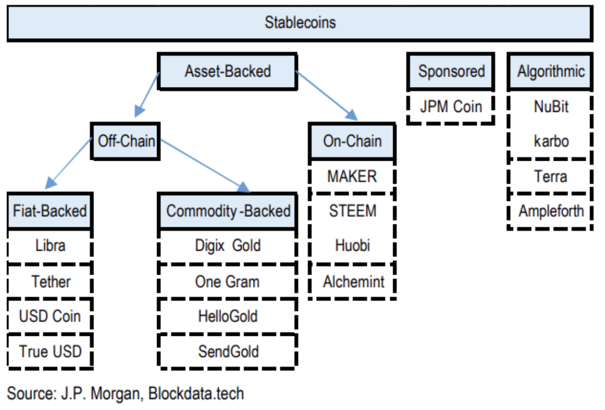 I promised above that I would spend more time on the definition of what a stablecoin is and how these things work. I’m still making my way along the learning curve myself, and given that there are over 100 projects, a standard definition is tough. The best definition and classification of projects I’ve seen so far comes from J.P. Morgan’s research team, which published a report in February 2020 entitled “Blockchain, digital currency and cryptocurrency: Moving into the mainstream?” Pages 41 through 57 dive into stablecoins with a focus on the Libra Coin. On page 43, they offer this nice little taxonomy of stablecoins.