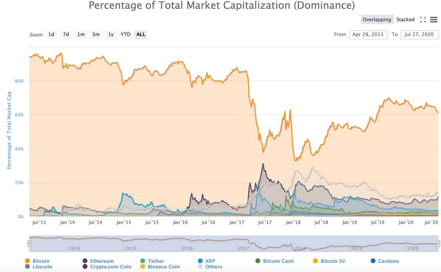 The total value of issued crypto-currency fluctuates quite a bit, but in the first half of 2020, it has been in the ballpark of $250B. As of July 17th, it was ~$270B. When one considers that mutual funds and ETFs are each multi-trillion dollar industries, crypto as an asset class is still tiny, but it punches above its weight in media attention and investor interest. The most recent example of this has been the admission by hedge fund investor Paul Tudor Jones that he has 2% of his portfolio allocated to Bitcoin.