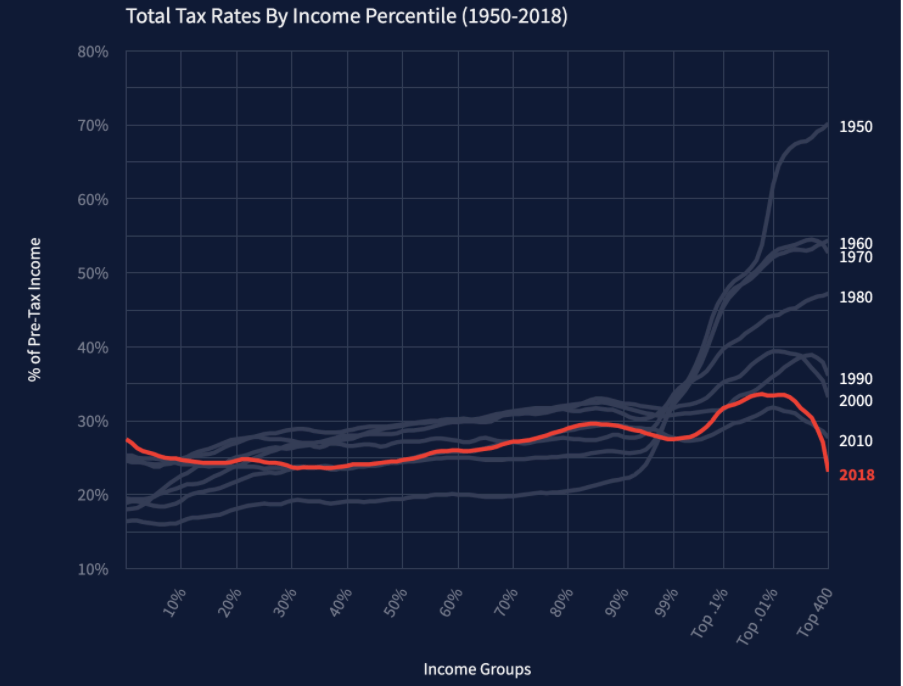 Given my preamble, it is no surprise that Saez and Zucman sit on the left ideologically and believe the US tax system is broken with the rich paying less than their fair share. Cobbling together a variety of sources into a database, they come to the conclusion that the US essentially has a flat tax rate where the mega-rich and the poor pay about the same rate of 28% on their income. Saez and Zucman have put together an online tool to visualize the analysis. The red line below shows the percentage of pre-tax income paid by each income band in the US. The big dip at the end of the red line illustrates that the top 400 income earners in the US pay the lowest rate of taxes.