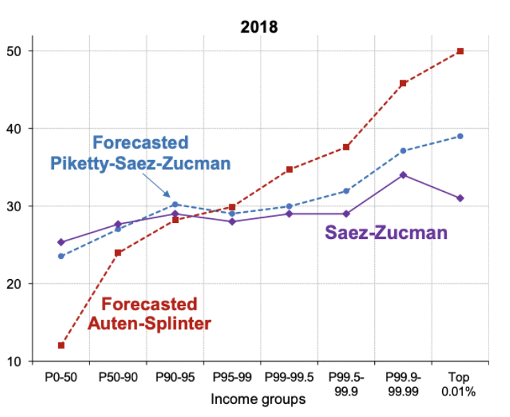 Splinter says Saez and Zucman got three things wrong when constructing their dataset. If one corrects for these three things, he contends that the US does not have a 28% flat tax rate but rather a progressive tax rate (as the red line illustrates below).