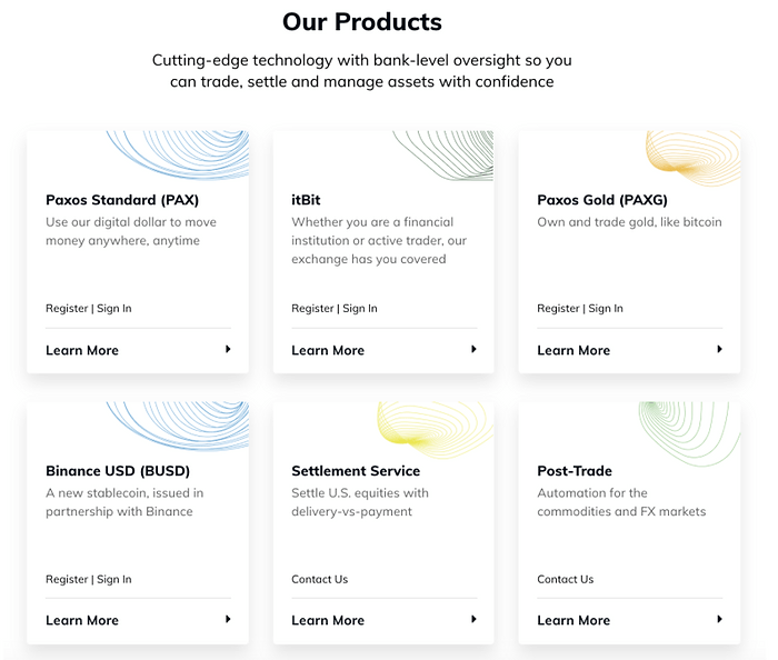 This screenshot from their homepage gives a sense of the broad range of products Paxos offers.