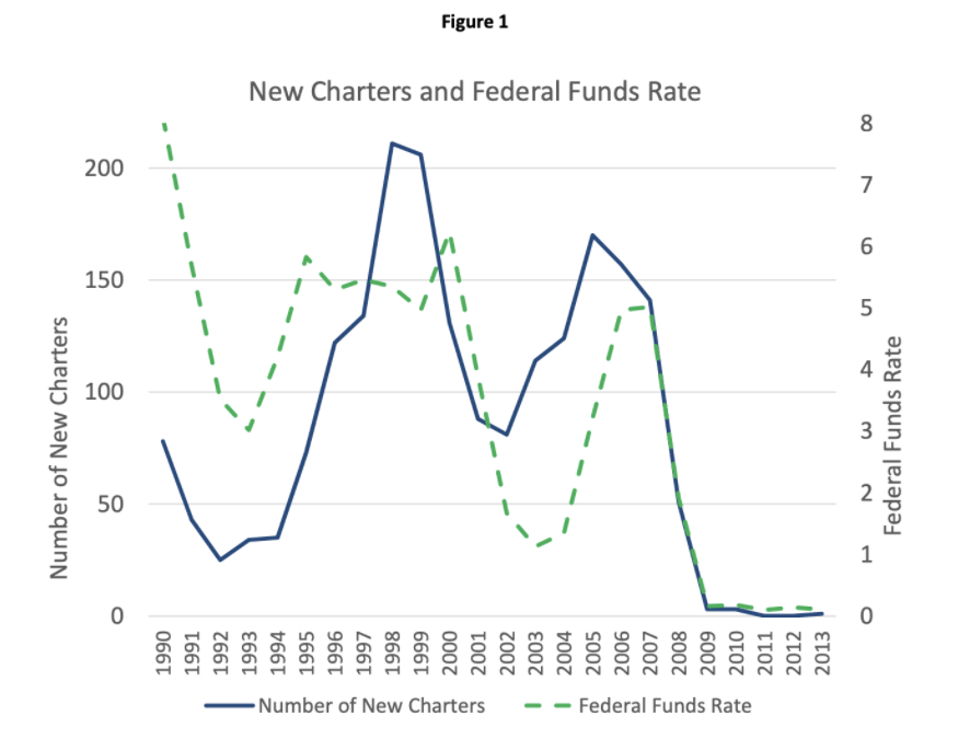 In addition to the financial crisis and the resulting Dodd-Frank Act limiting the number of new banks, we have also seen a lot of mergers since the 1980s following a period of deregulation. Another driver of the shrinking number of banks is interest rate policy. This report from the Federal Reserve is a few years old, but it provides a fascinating look at this topic. The graph below shows the correlation between the level of interest rates and the number of new bank charters. Banks primarily generate revenue from their net interest margin (NIM), so it’s no surprise that in low-rate environments fewer people want to start banks.