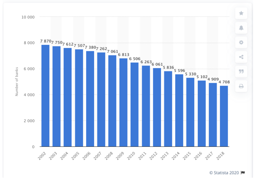 All of these factors come together giving us this second graph below showing the downward trend line in the number of banks in the US. We’ve gone from roughly 8,000 banks 20 years ago to about 4,700 today. This is even more noteworthy when you consider that there were 15,000 banks in the early 1980s.