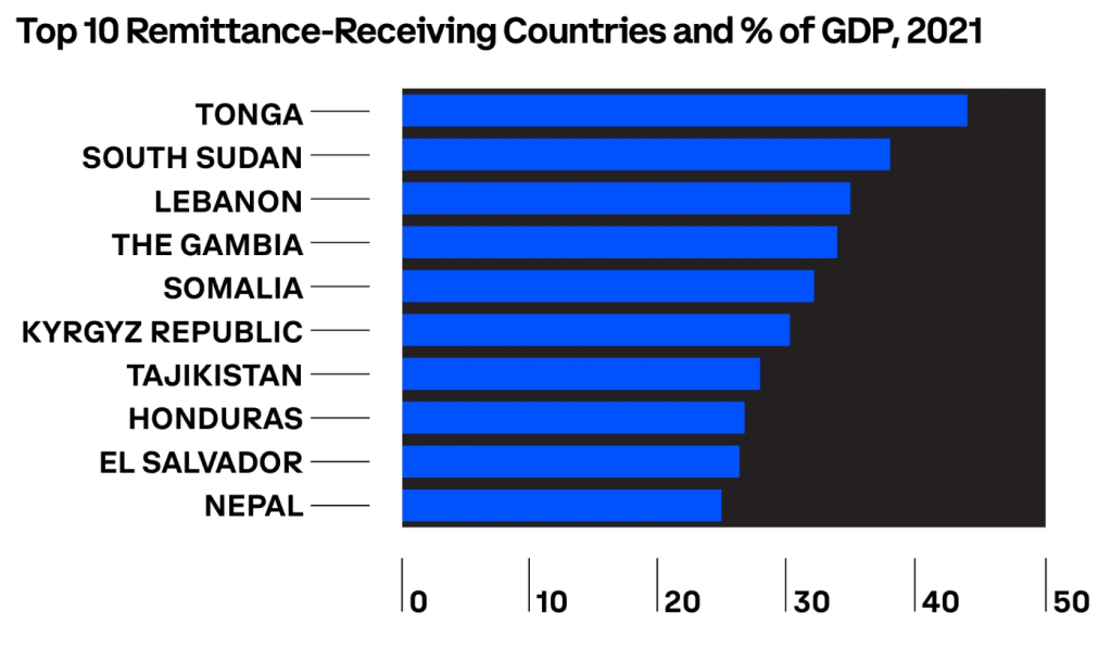 Not surprisingly, $857B is a lot of money. Remittances are a big deal and in some countries make up a significant portion of GDP. India is obviously one of the world’s largest economies at $3.57T, so while the $89B of incoming remittances is absolutely significant and life-changing for many families, it only represents ~2% of India’s GDP. For much smaller economies though, remittance flows can account for over 20% of GDP. The chart below shows the countries where remittances account for the largest share of national GDP.