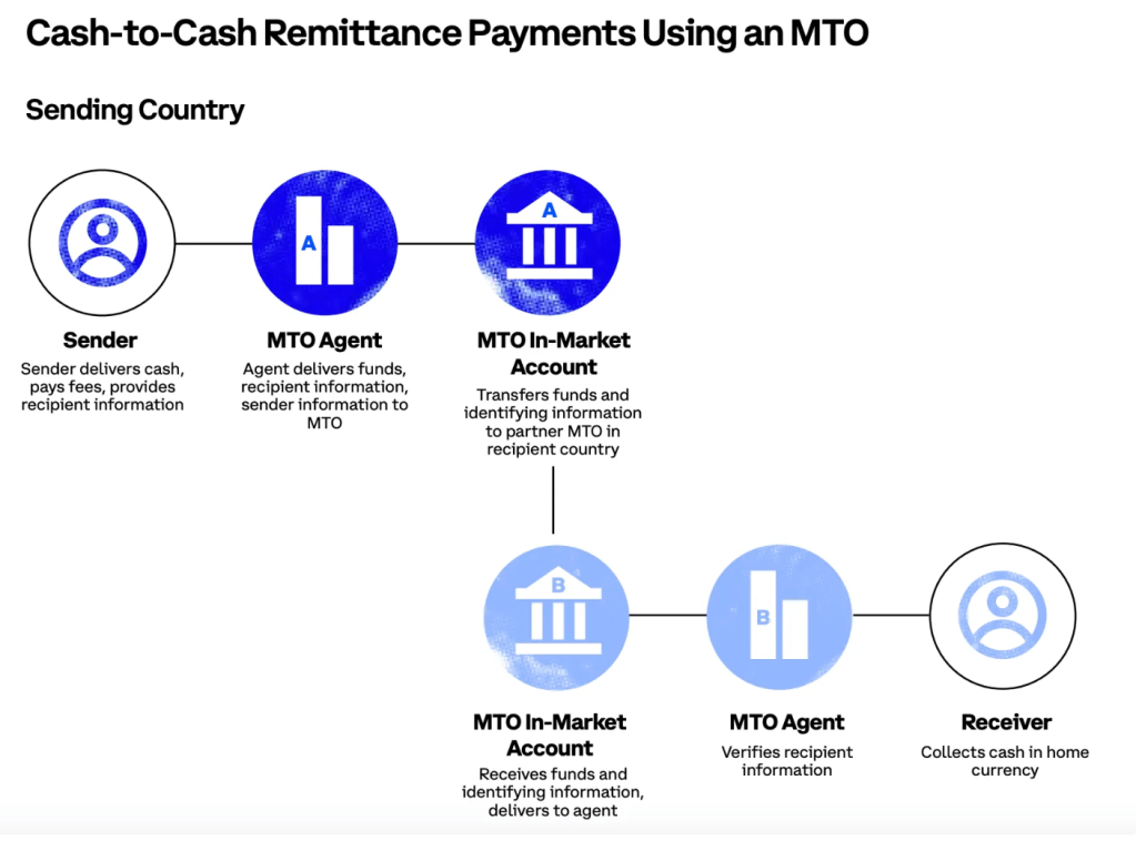 As discussed above, there are several different channels used for sending remittances. I could write a whole other article on the different transfer methods, but at a high level, some version of the graphic below occurs (thanks to the Coinbase Institute for the graphics). Let’s take the example of a person in the United States who sends funds to Mexico. In the simplest example, a person takes some cash she’s earned in the US, goes to a money transfer agent in New York City, and then that money is sent on its way via the agent’s network. Depending on where the funds are going, that money might stay within the agent’s existing network or hop between several banks. The recipient eventually heads to their own local agent in Mexico and takes cash out.
