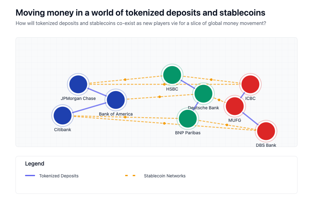 As I sit here in July 2025, there are still a lot of unknowns. I have a loosely held hypothesis that we might end up in a world of closed loop tokenized deposit consortiums that are then connected to the broader financial ecosystem via stablecoins.