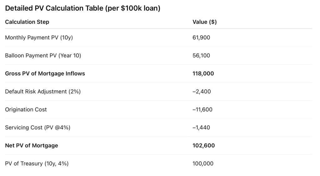 Here is a very simple example putting a $100k mortgage side by side with $100k invested in treasuries. There are a lot of assumptions baked in here, so please note that. There is also another layer with the mortgage resale market, but for now, I just wanted to look at the profitability of originating a loan vs. investing in treasuries. As you will see below, the originating the mortgage loan is modestly more profitable.